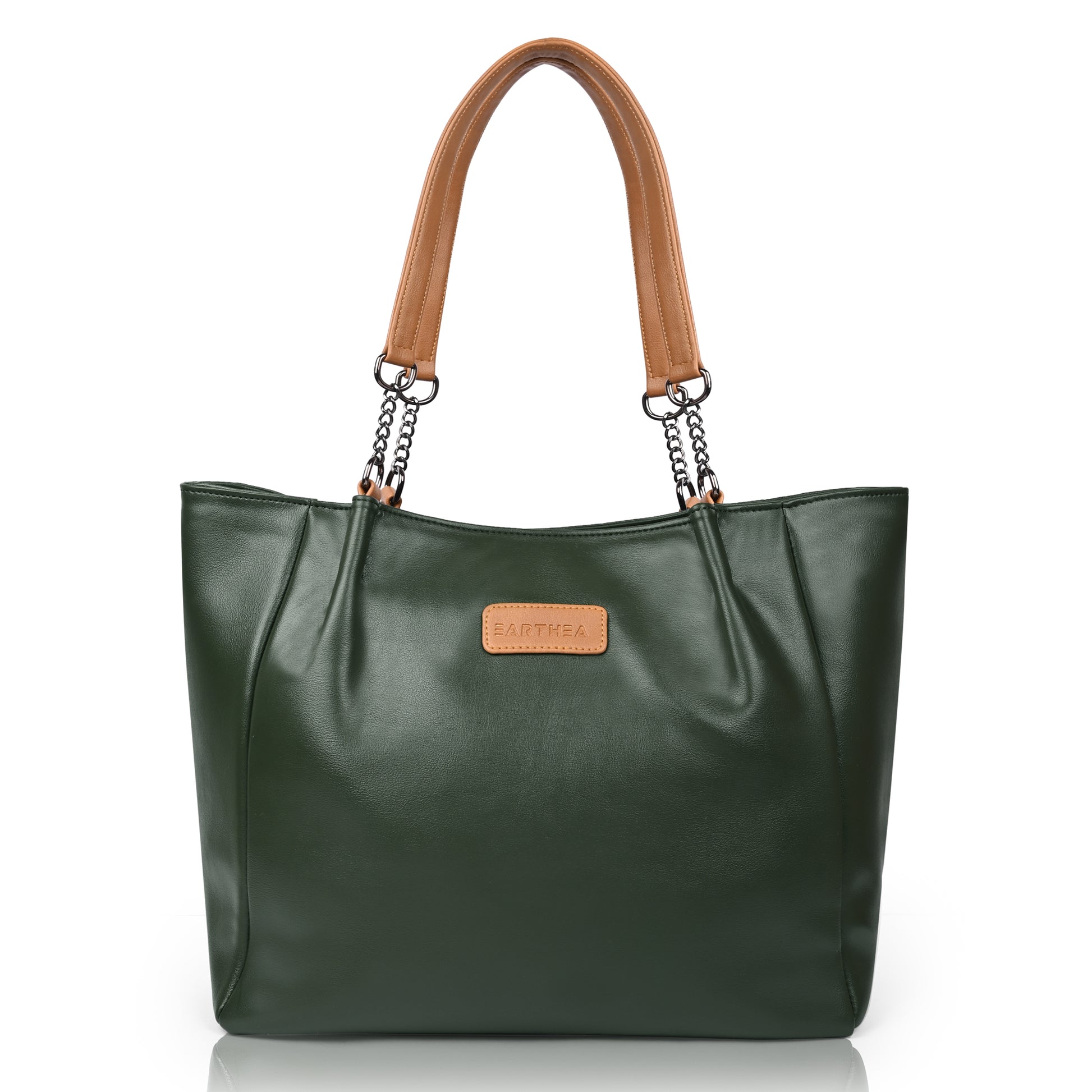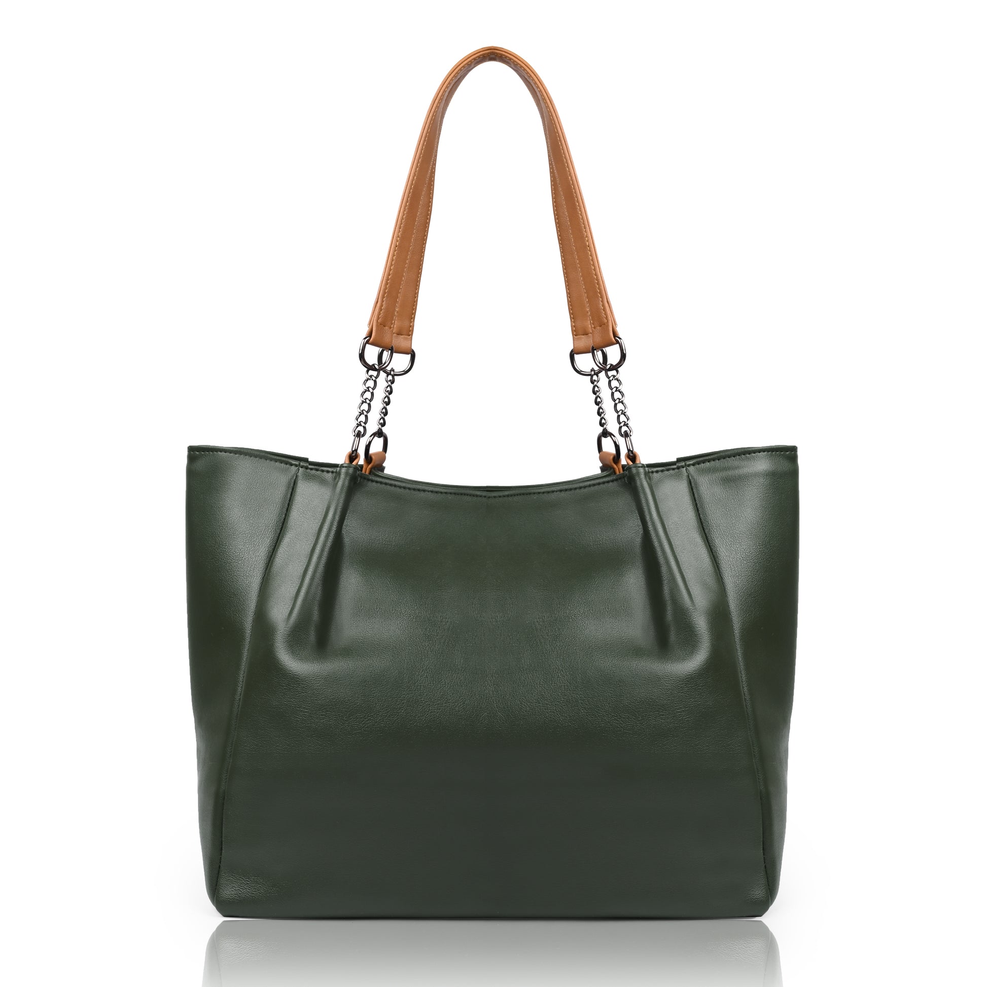 This green tote bag, with its sleek finish, is a perfect blend of style and practicality. Crafted from eco-friendly faux leather, it provides a cruelty-free and sustainable option for the modern individual. The bag's spacious interior and organized compartments are ideal for daily use, keeping all your essentials secure and easily accessible. Its durable yet lightweight design effortlessly enhances any outfit, making it a versatile choice for any occasion.