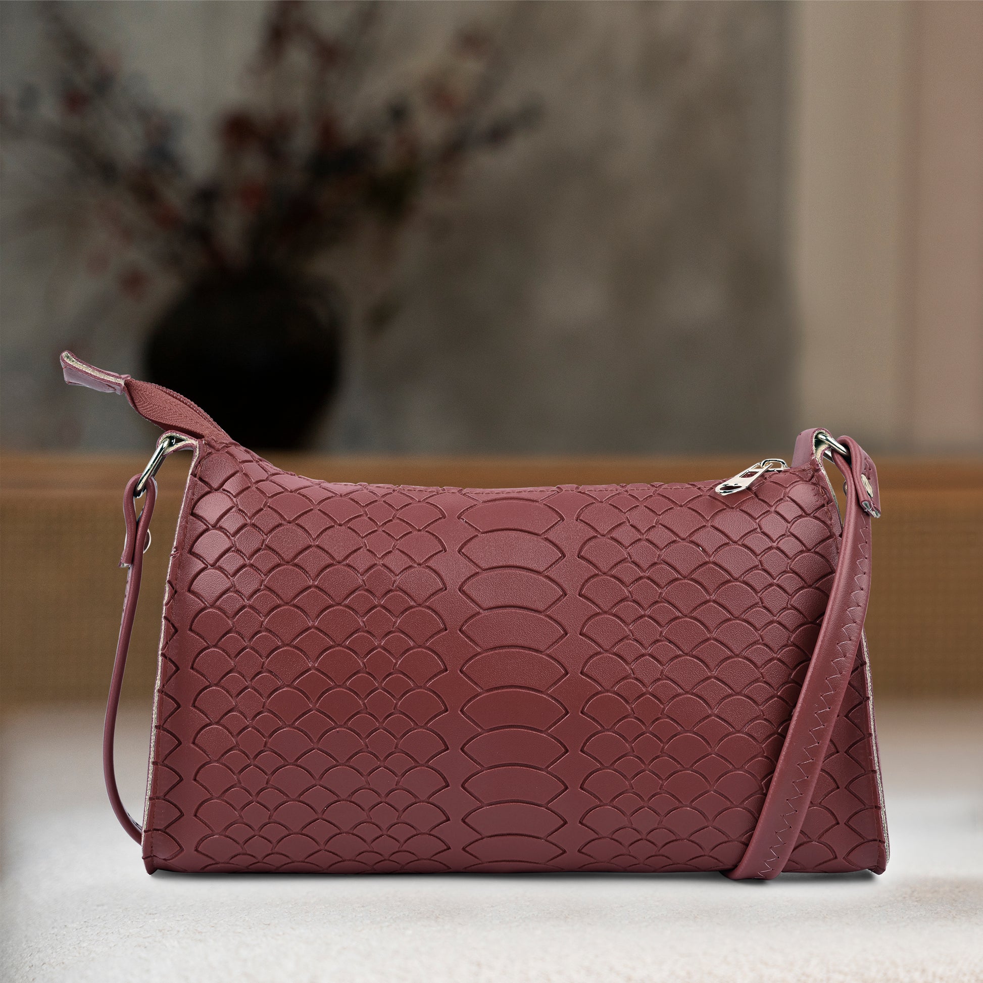 This red textured faux leather crossbody bag is a stylish and versatile accessory. The bag's elegant curved shape and sophisticated scale pattern are complemented by gold-tone hardware. It has a secure main compartment and an interior pocket, perfect for keeping your daily essentials organized. With an adjustable strap, you can wear it as a crossbody or on your shoulder. Crafted from durable material, this western-style purse is both fashionable and practical for everyday use.