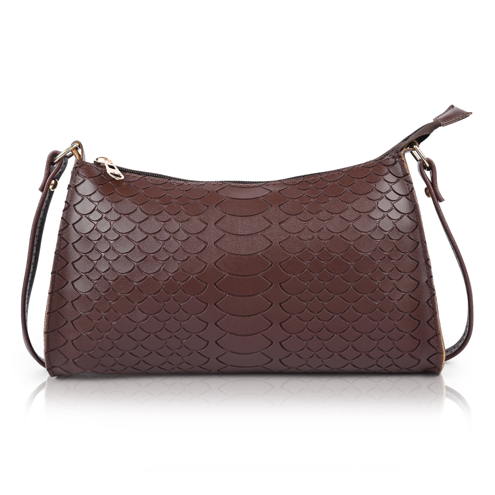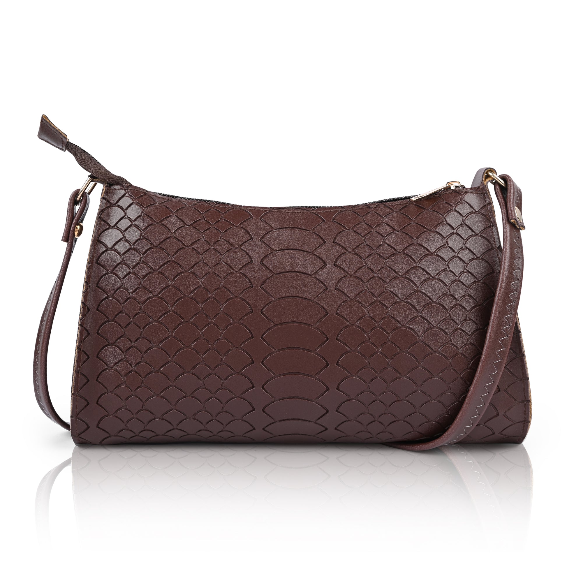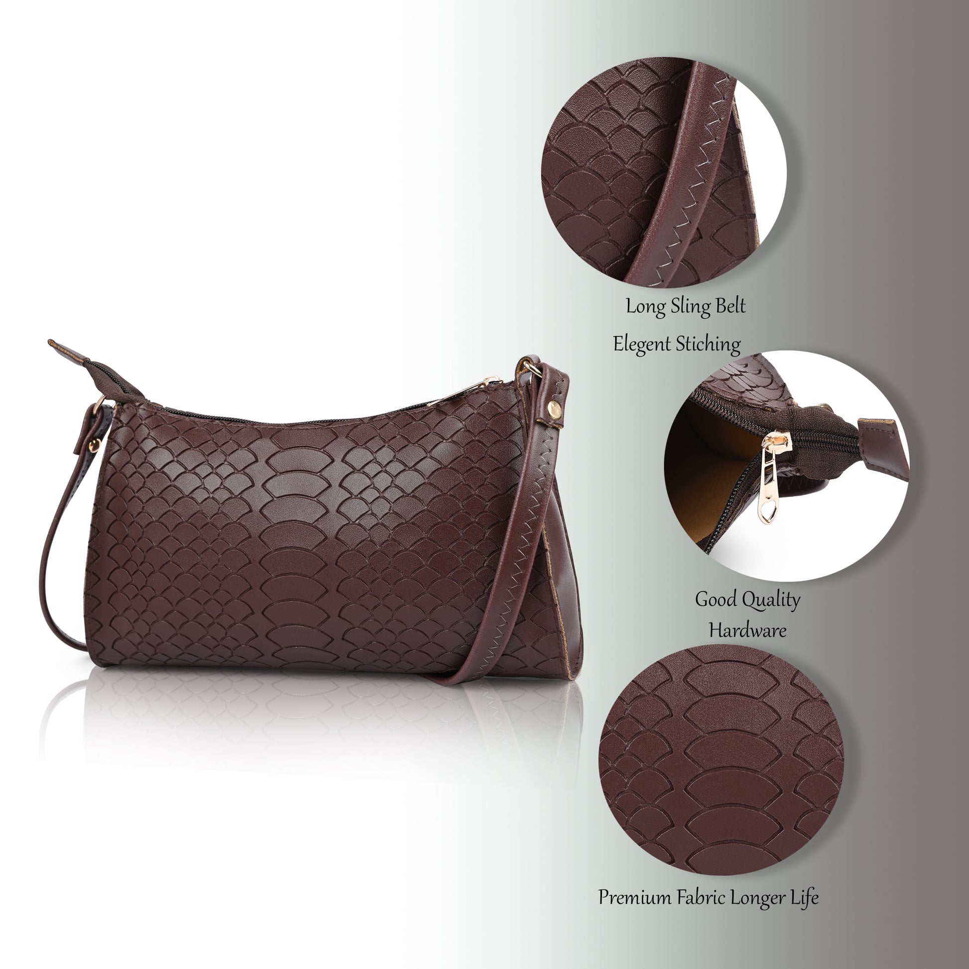 This elegant crossbody bag is a stylish and versatile accessory. The bag's curved shape and textured faux leather exterior, featuring a subtle scale pattern, are accented by sophisticated gold-tone hardware. It offers practical storage with a main zippered compartment and an interior pocket to keep your daily essentials organized. The adjustable strap lets you wear it as a crossbody or on your shoulder for a comfortable and customizable fit. Crafted from durable materials with quality stitching, this compact, western-style purse is made to last and is perfect for everyday use.